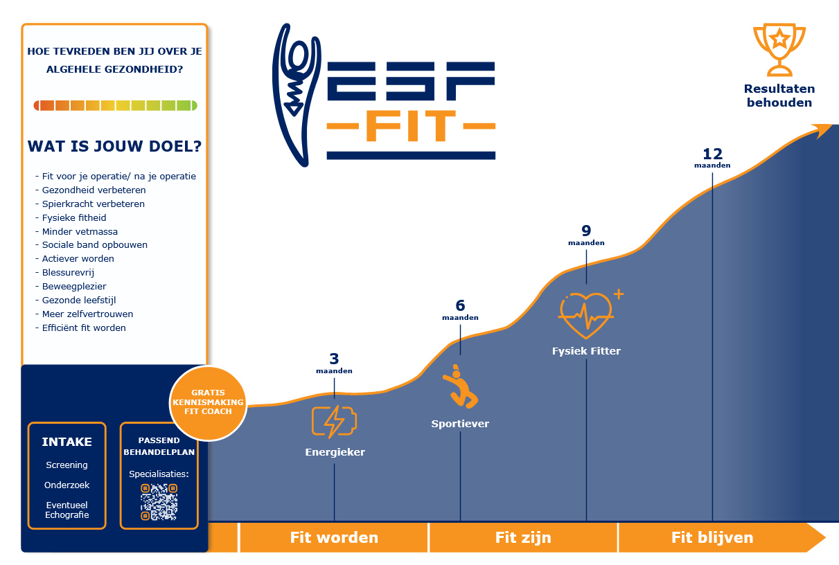 ESF-FIT bevindt zich in fysiotherapie praktijk ESF Praktijk. Dit biedt jou de unieke mogelijkheid om jouw revalidatie te combineren met de slimme kracht van Egym waardoor revalideren veilig, duurzaam en leuk wordt. Onze fitcoaches werken nauw samen met de fysiotherapeuten en je zult regelmatig een fysiotherapeut rond zien lopen.